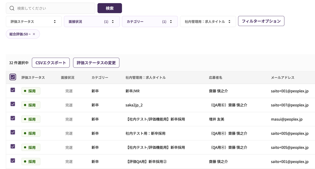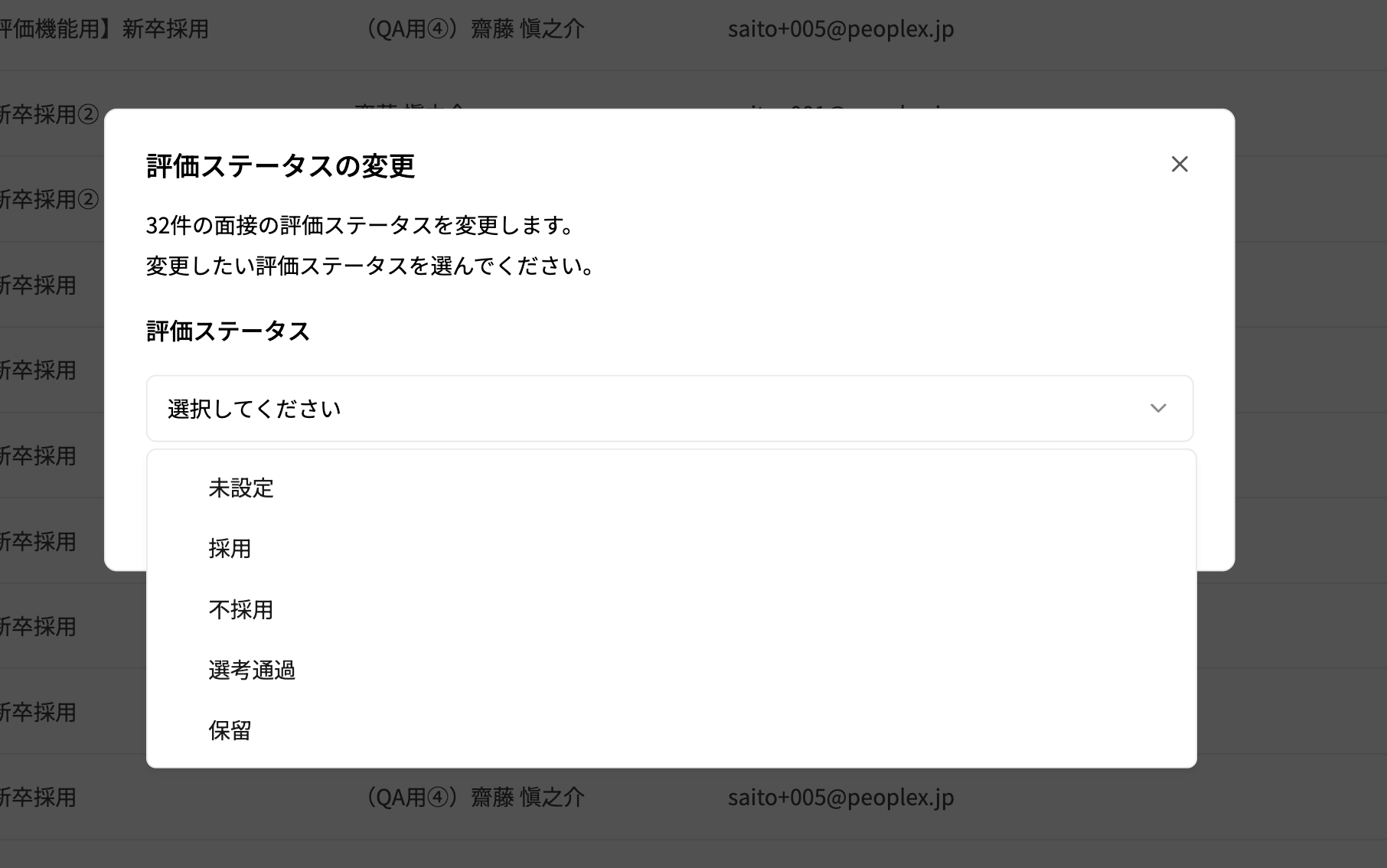 面接の評価ステータス(採用、不採用、保留、選考通過)を一覧画面から一括で更新できるようになりました。 これにより、ある条件に一致した候補者は一括で選考通過などの運用が可能になりました。(例えば、総合評価が70点以上の候補者を一括で採用にするなど)