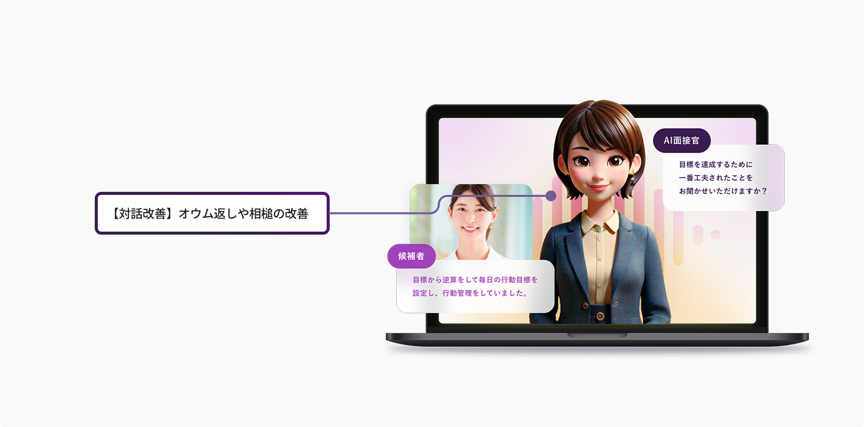 【対話改善】オウム返しや相槌の改善 対話モデルのバージョン更新後、AI面接官の反応が控えめになっていましたが、自然なオウム返しや相槌に修正することで、より親しみやすく、円滑なやり取りができるようになりました。